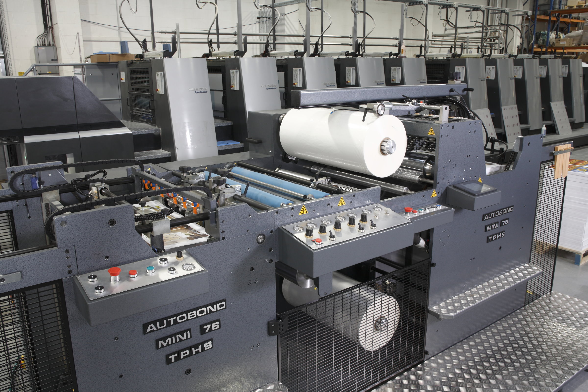 Die Laminiermaschine AUTOBOND Mini TH 76 laminiert einseitig oder zweiseitig bis 60 Meter/Minute. Laminieren vom Bogenformat 76 x 102 cm bis minimal SRA 4. Der Palettenanleger ist mit einem Heidelberg Speedmaster 74 Saugkopf rausgerüstet. Das Laminieren ist für Papierstärken von 90 bis 650 g/qm mit bis zu 6 Tonnen Druck möglich.